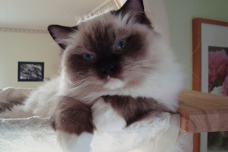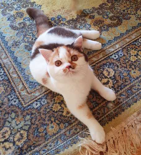 Iris hade det tufft de första månaderna, många luftvägsinfektioner som inte riktigt försvann. Efter att ha träffat en underbar veterinär på Västra Djursjukhuset som tänkte lite ”utanför boxen” kom de fram till att hon hade en polyp som opererades bort och sen blev hon en pigg och frisk kattunge igen.Hon fick stanna kvar hos oss och har utvecklats till en ung skön dam med ett otroligt temperament. Ropar man på henne kommer hon skuttande som en hund och hoppar upp i knät och spinner på högsta volym. Hon har fått fina bedömningar på utställningar och förhoppningsvis fortsätter hon att utvecklas bra och kommer att få träffa en lämplig hane framåt sommaren.